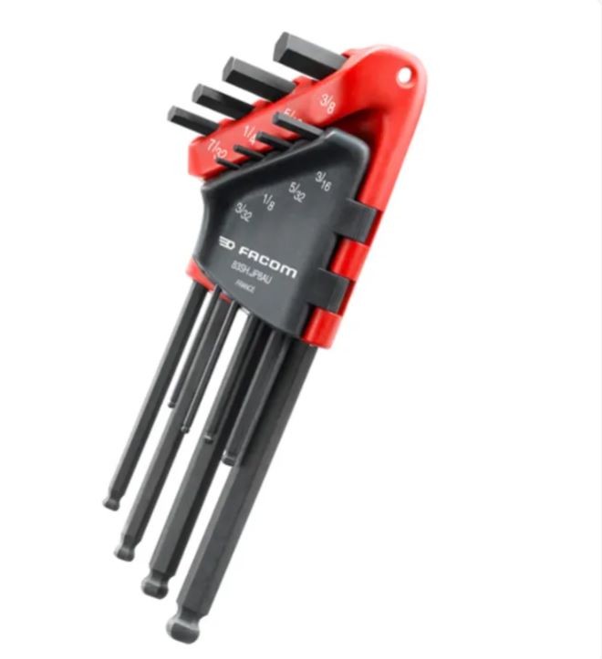 Facom 8 piece, hexagon keys are packaged within a smart, compact wallet that has been designed for ease of key selection and organisation. This set of hex keys is long reach, making them the perfect solution to reach deeply in-set bolts. These L-shaped hand tools are used to tighten or loosen fasteners and fixings with a hexagonal configuration. The spherical head allows for quicker and easier screwing with a tilt angle up to 30°.