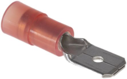 CMD2674136 Red Insulated Crimp Receptacle, 6.35 x 0.8mm. RS Pro range of insulated crimp tab wire terminals made from brass with a copper sleeved barrel. These male tab connectors have vinyl or nylon insulation with a flared design for easy wire insertion.